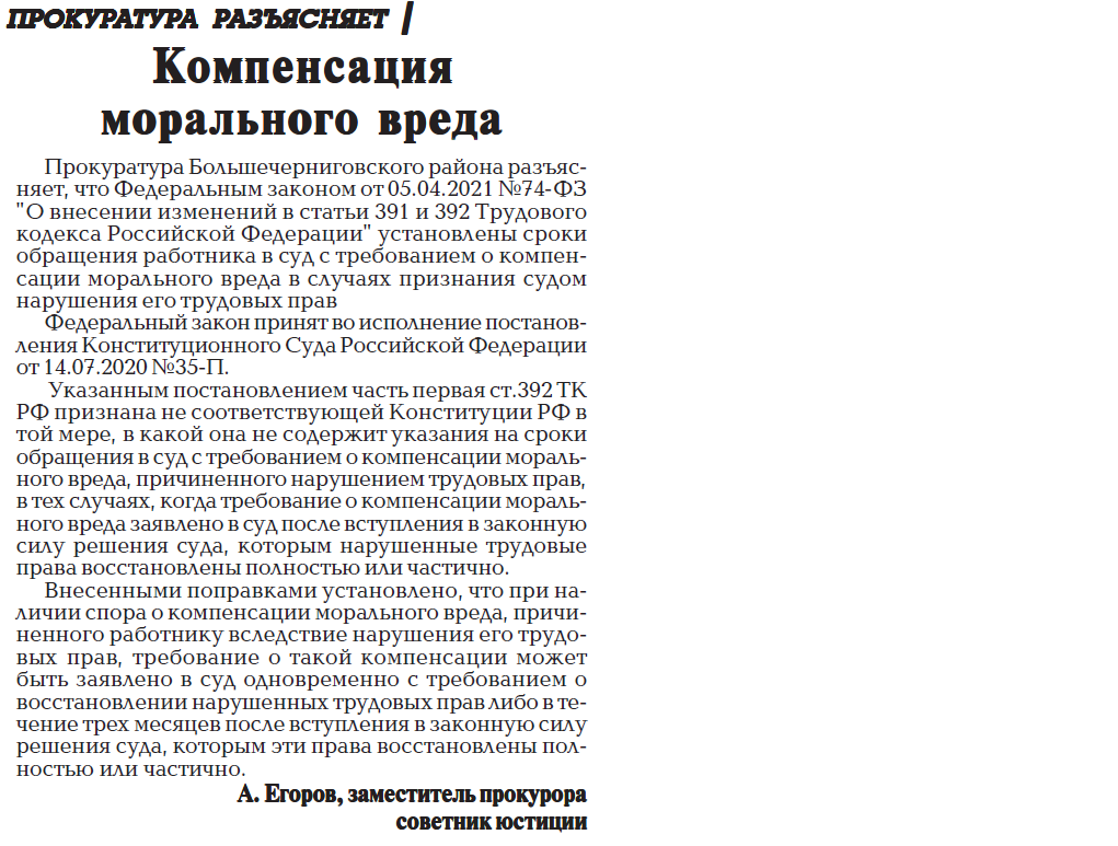Прокуратура Большечерниговского района разъясняет: "Компенсация морального вреда"