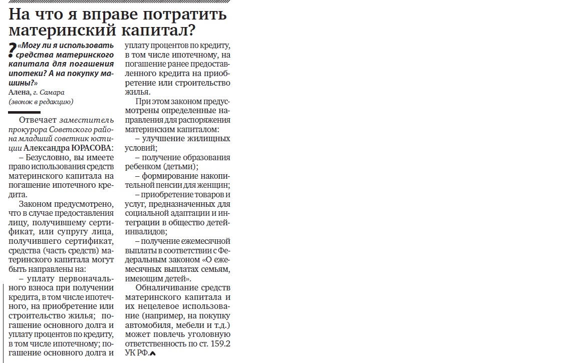 Прокуратура Советского района г. Самары разъясняет: "На что я вправе потратить материнский капитал?"
