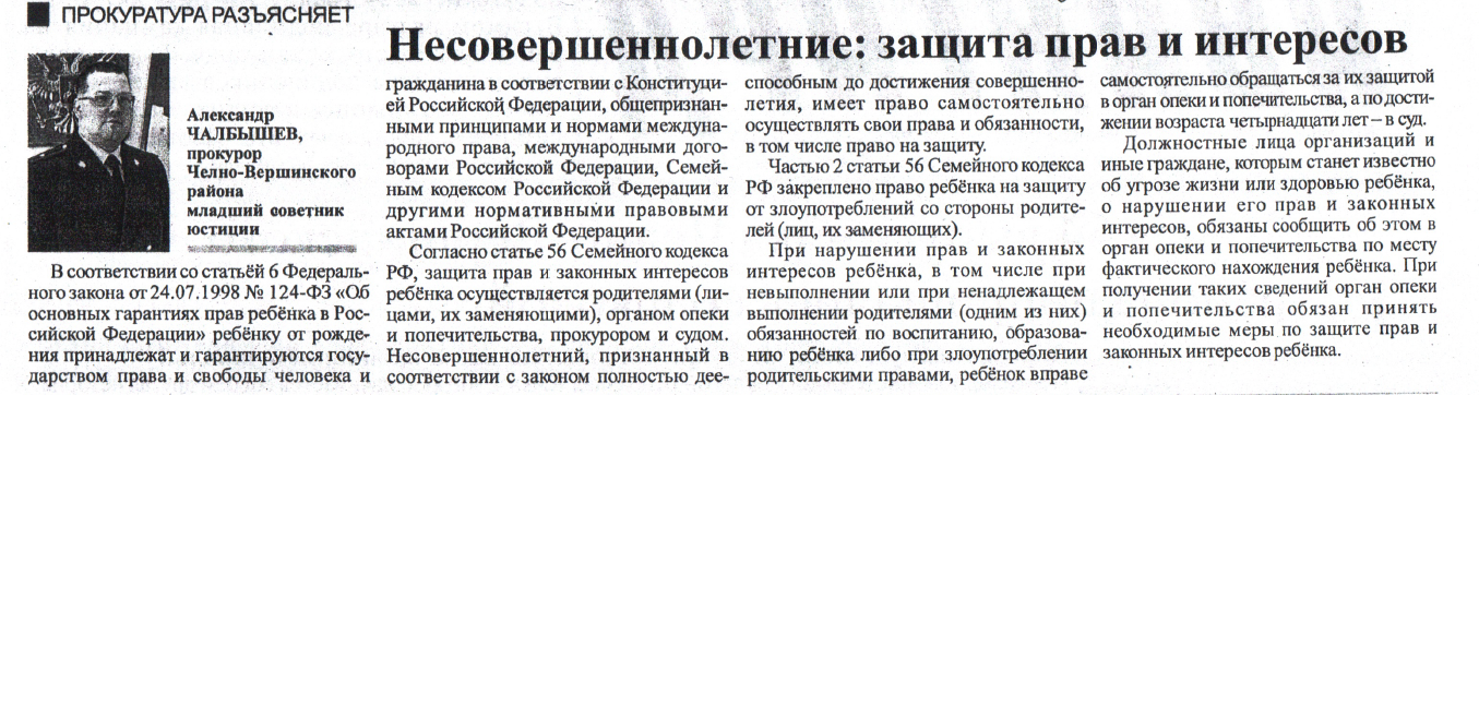 Прокуратура Челно-Вершинского района разъясняет: "Несовершеннолетние: защита прав и интересов"