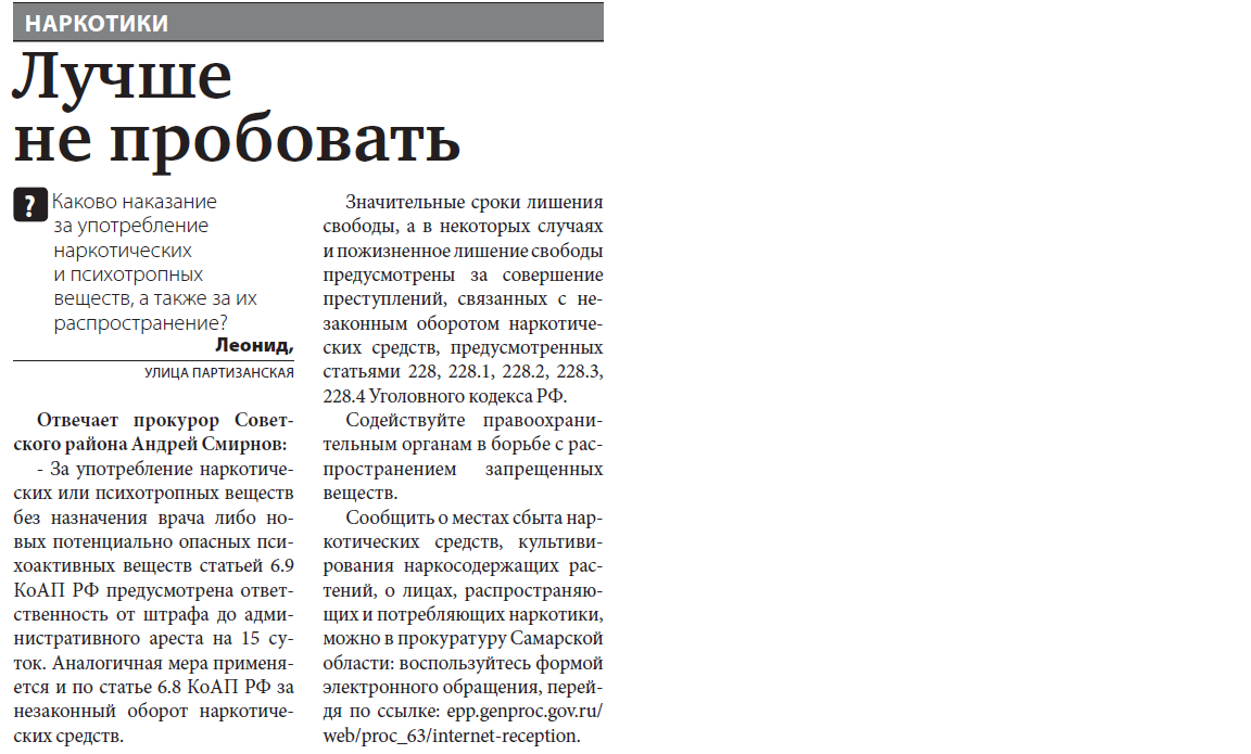 Прокуратура Советского района г. Самары "Каково наказание за употребление наркотиков и психотропных веществ?"