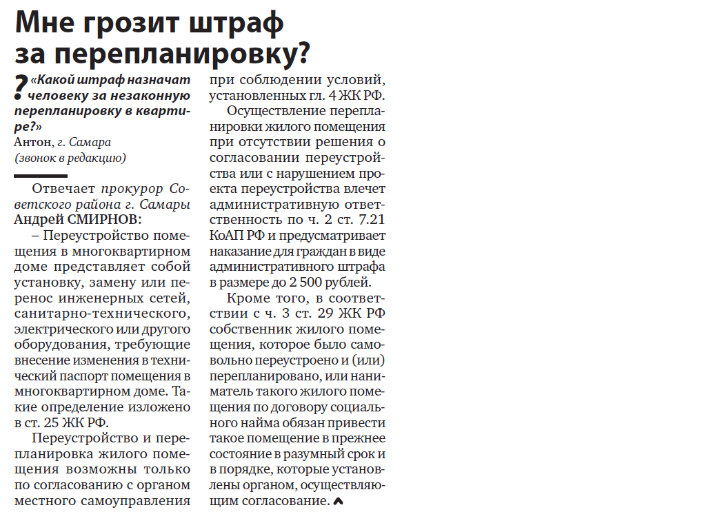 Прокуратура Советского района г. Самары разъясняет: "Штраф за перепланировку"