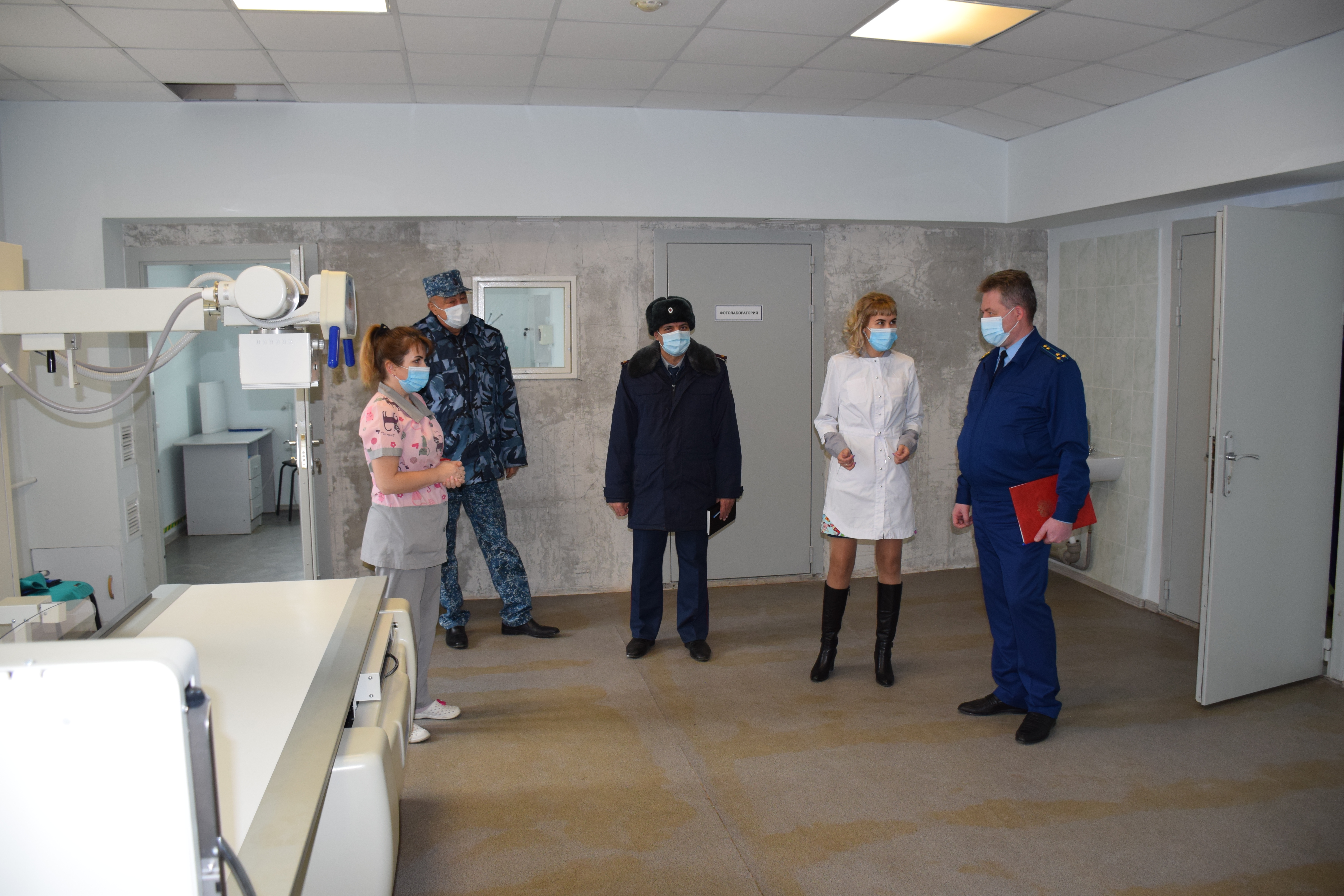 Заместитель прокурора области осуществил обход территории учреждения, в ходе которого посетил осуждённых отряда по хозяйственному обслуживанию учреждения, ряд камер для содержания подозреваемых и обвиняемых в совершении преступлений, в том числе несовершеннолетних и женщин, а также рабочие кабинеты медико-санитарной части.