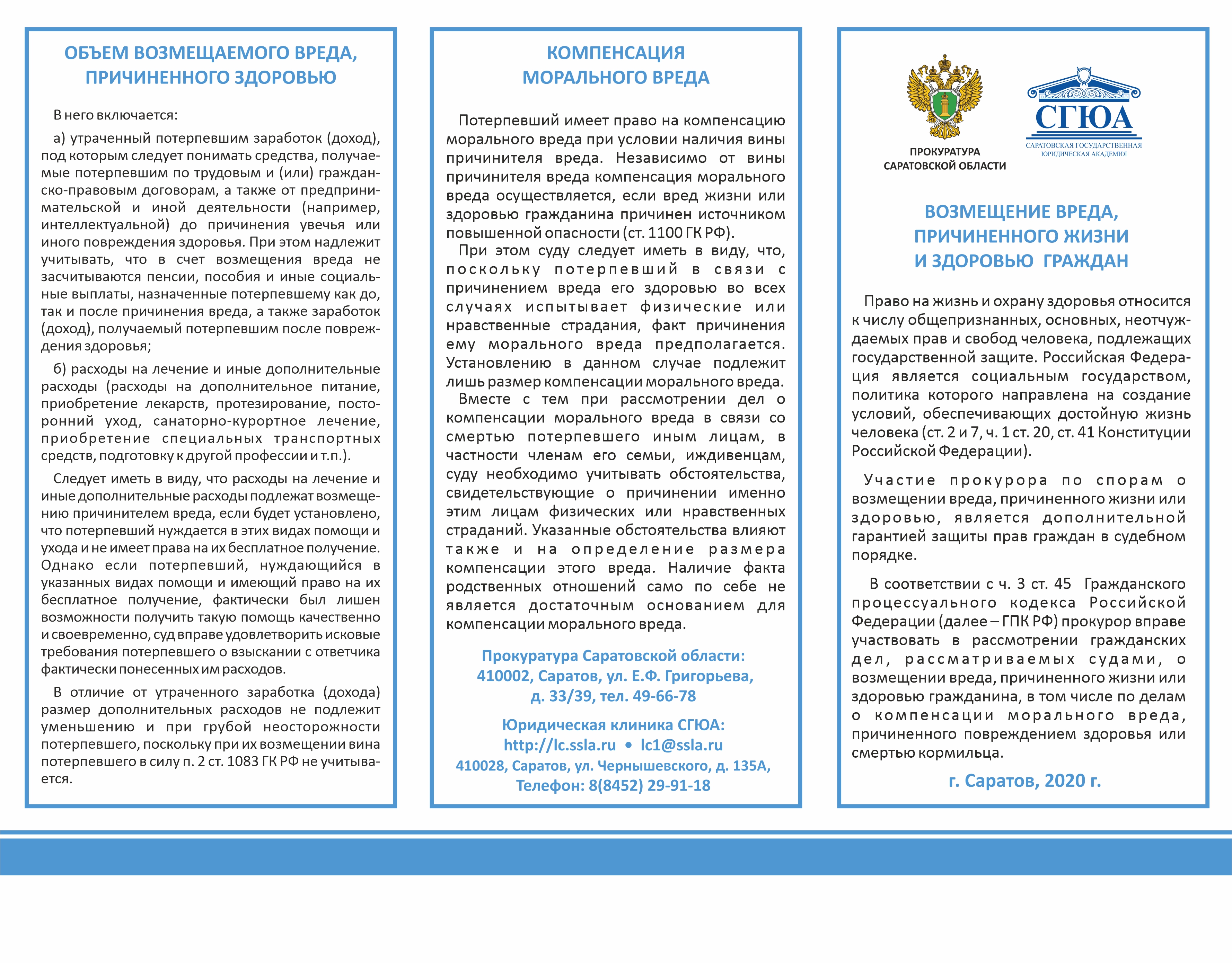 Буклет по вопросу возмещения вреда, причиненного здоровью и жизни граждан, подготовлен прокуратурой Саратовской области в сотрудничестве с ФГБОУ ВО "Саратовская государственная юридическая академия". Изготовлен и распространен в количестве 500 экземпляров. Распространен в ходе просветительских мероприятий.