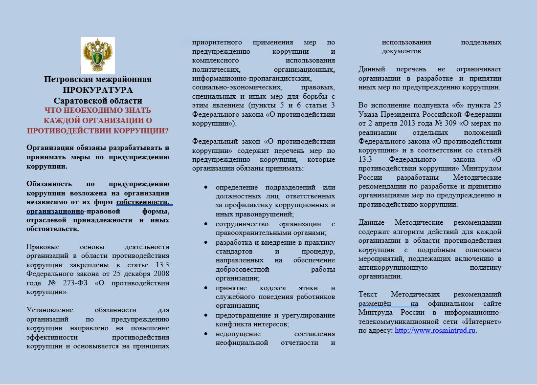 Памятка Петровской межрайонной прокуратуры информирует организации об обязании разрабатывать и принимать меры по предупреждению коррупции