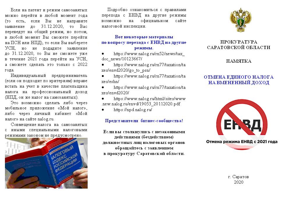 Памятка по вопросу отмены единого налога на вмененный доход. Разработана прокуратурой Саратовской области