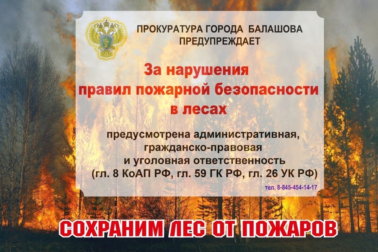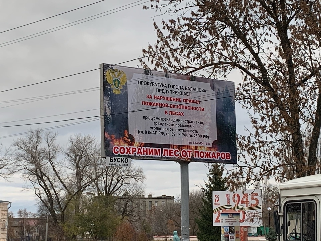Из года в год продолжает оставаться актуальным вопрос соблюдения правил пожарной безопасности в лесах. С целью информирования граждан об установленной законом ответственности в данной сфере прокуратурой г. Балашова разработан баннер, размещенный на одной из центральных улиц города.