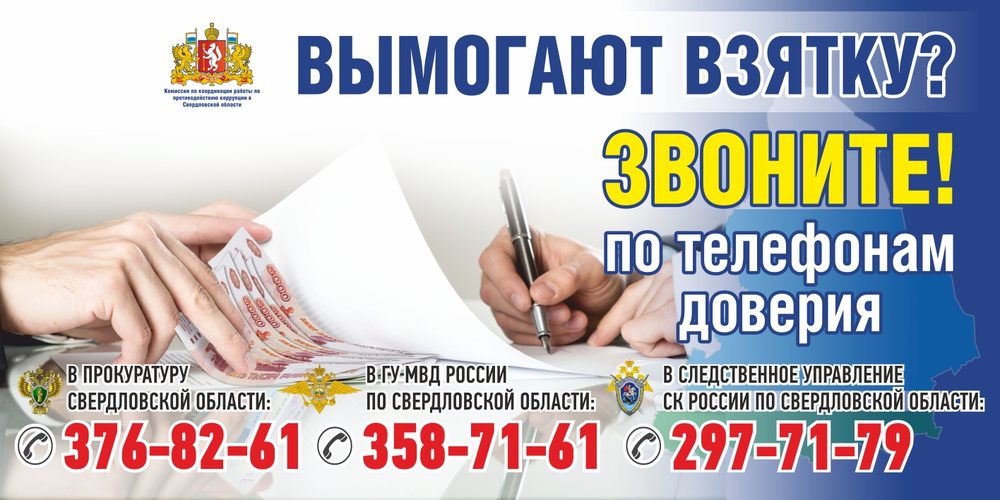 Баннер "Вымогают взятку? Звоните" подготовлен прокуратурой Свердловской области совместно с Комиссией по координации работы по противодействию коррупции в Свердловской области и размещен на улицах г.Екатеринбурга.