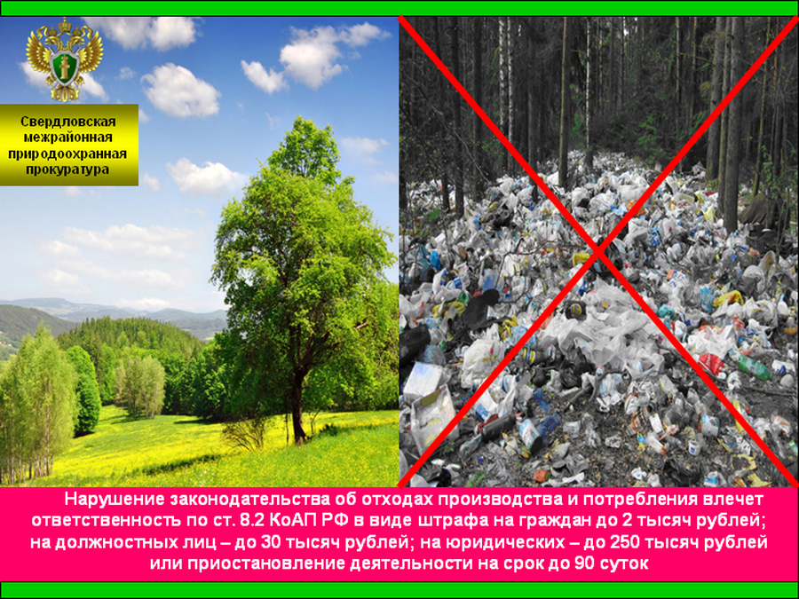 Плакаты, направленные на противодействие экологическим правонарушениям подготовлены Свердловской межрайонной природоохранной прокуратурой и размещены в зданиях автовокзалов, учреждений, торговых центрах, иных общественных местах, на мультимедийных экранах