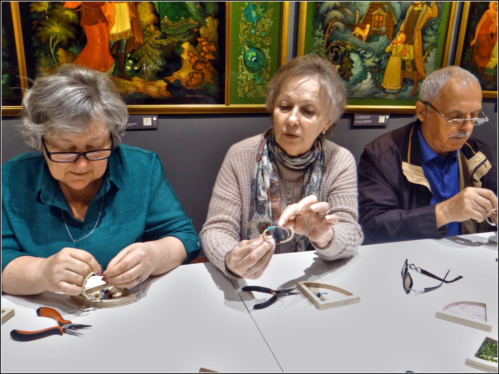 Очень профессиональным и познавательным был рассказ лектора об истории создания и богатстве коллекций музея. По окончанию экскурсии ветераны с интересом постарались освоить секреты мастерства изготовления украшений.