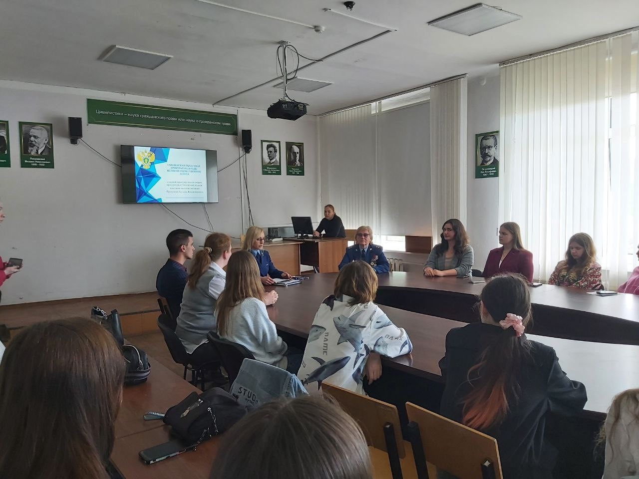 Во исполнение пункта 12 плана мероприятий по подготовке и проведению в 2025 году празднования 80-й годовщины Победы в Великой Отечественной войне 1941-1845 годов, утвержденного Генеральным прокурором Российской Федерации от 09.09.2024, пункта 2 плана мероприятий прокуратуры Смоленской области по подготовке и проведению в 2025 году празднования 80-й годовщины Победы в Великой Отечественной войне 1941-1845 годов от 02.10.2024, старшим прокурором отдела кадров прокуратуры Смоленской области младшим советником юстиции Прокоповой Татьяной Владимировной совместно с председателем Совета ветеранов и пенсионеров прокуратуры Смоленской области Погореловой Ириной Анатольевной осуществлена встреча со студентами Международного юридического института (Смоленский филиал) в формате круглого стола, в ходе которой старшим прокурором отдела кадров прочитана лекция на тему: «Смоленская областная прокуратура в годы Великой Отечественной войны».