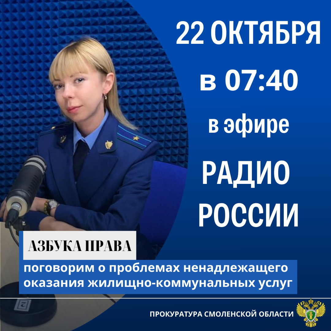 Завтра, 22 октября, в 07 часов 40 минут в эфир «Радио России» выйдет очередной выпуск программы «Азбука права», в котором старший помощник прокурора Промышленного района г. Смоленска Екатерина Иванова расскажет об основных проблемах ненадлежащего оказания жилищно-коммунальных услуг, а также о способах защиты прав граждан - потребителей таких услуг.
