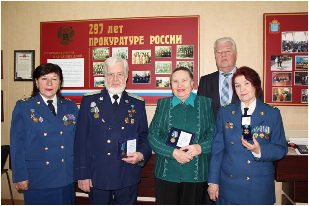Поздравили ветераны и своих коллег, которым прокурор области торжественно вручил ведомственные награды: медаль Руденко вручена Владимиру Владимировичу Манухину; медаль Ягужинского - Лидии Александровне Филатовой; медаль «Ветеран прокуратуры» - Борису Николаевичу Никулину; знак отличия «За верность закону 1 степени» - Валентине Григорьевне Павловой.