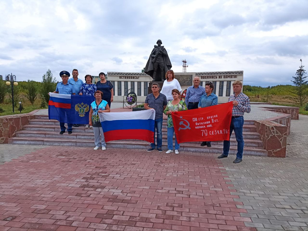 Здесь, на фоне бронзового памятника неизвестному солдату, танка ИС-2 и «рабочей лошадки» Великой Отечественной войны — грузовика - «полуторки», ветераны прокуратуры раскинули свои 3 флага, привезённые с собой: флаг Российской Федерации, Флаг прокуратуры Российской Федерации и Знамя Победы.