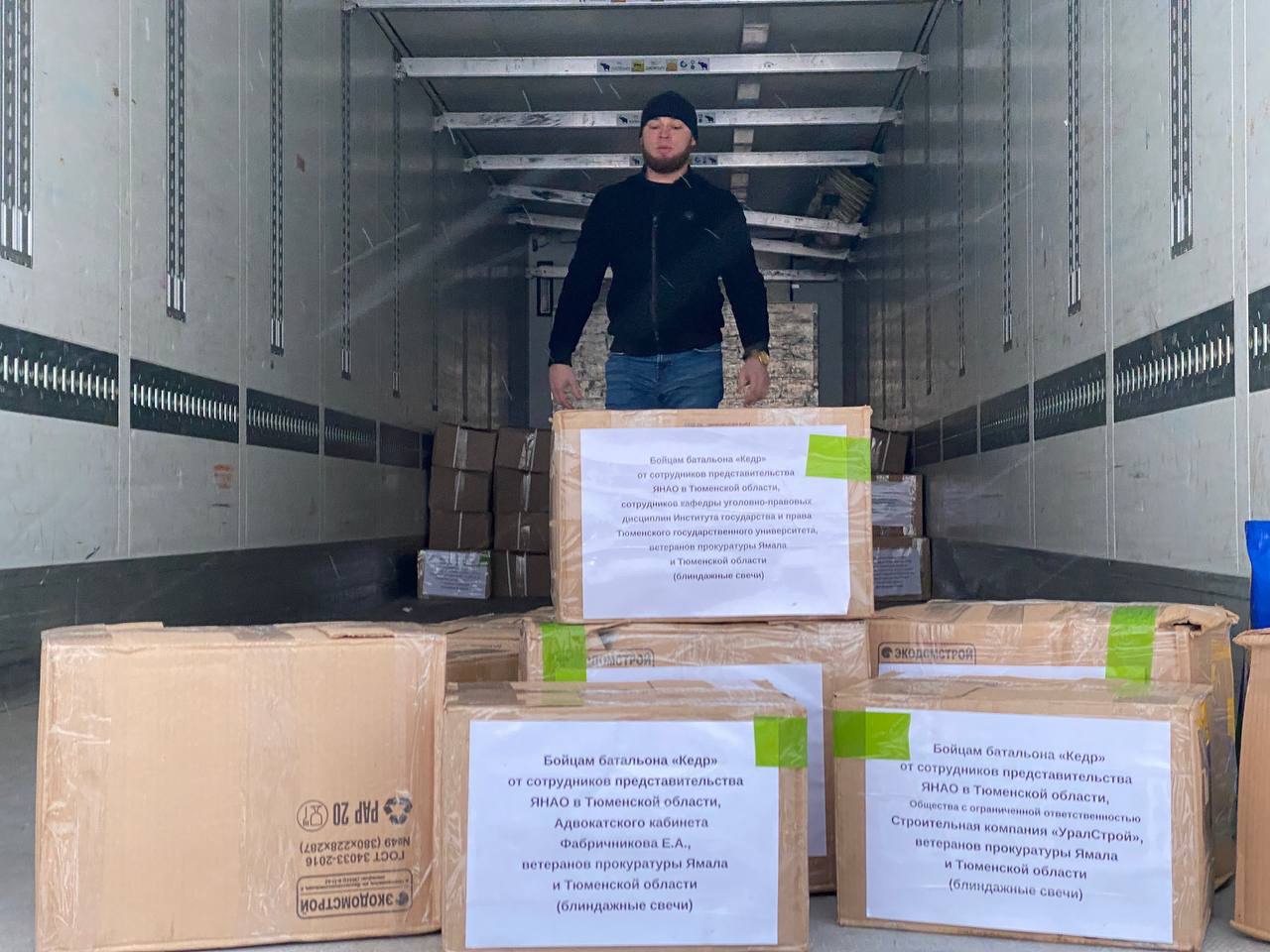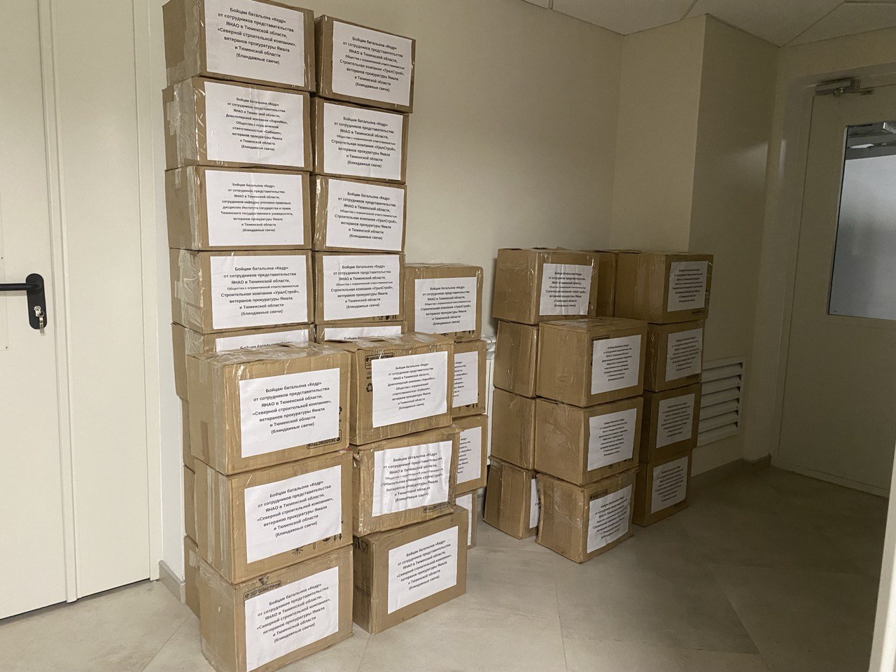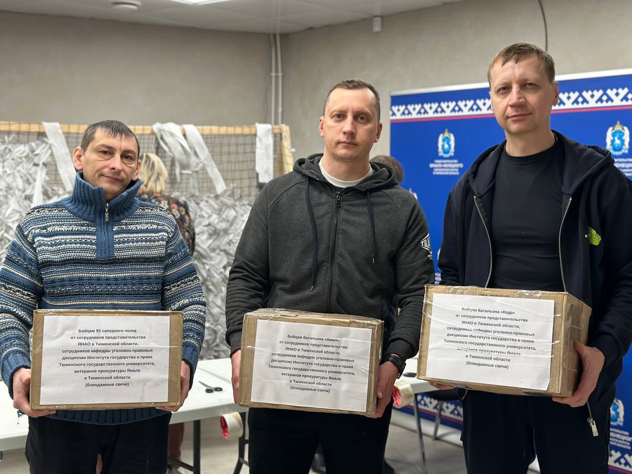 На этот раз в батальоны, сформированные из мобилизованных Тюменской области и Ямало-Ненецкого автономного округа, направлено 5743 блиндажных свечи, 6 комплектов индивидуальной маскировочной защиты и большая маскировочная сеть класса «кикимора» расцветки «грязный снег», сделанные участниками проекта.