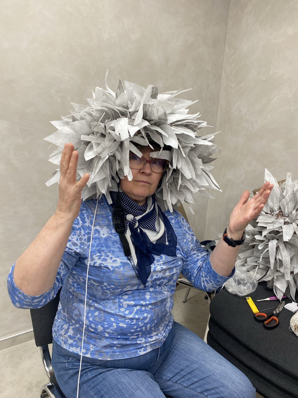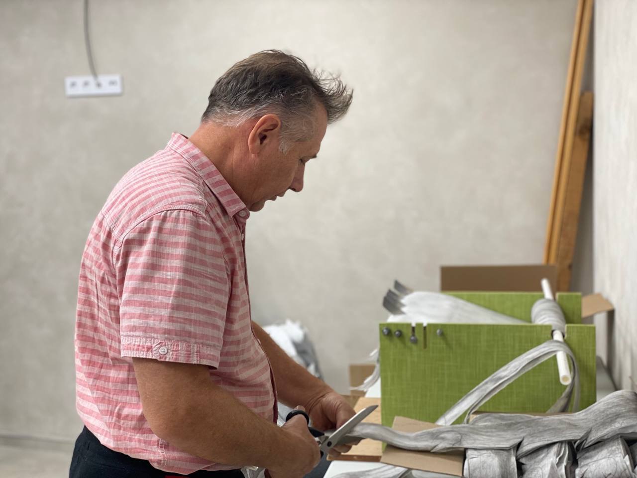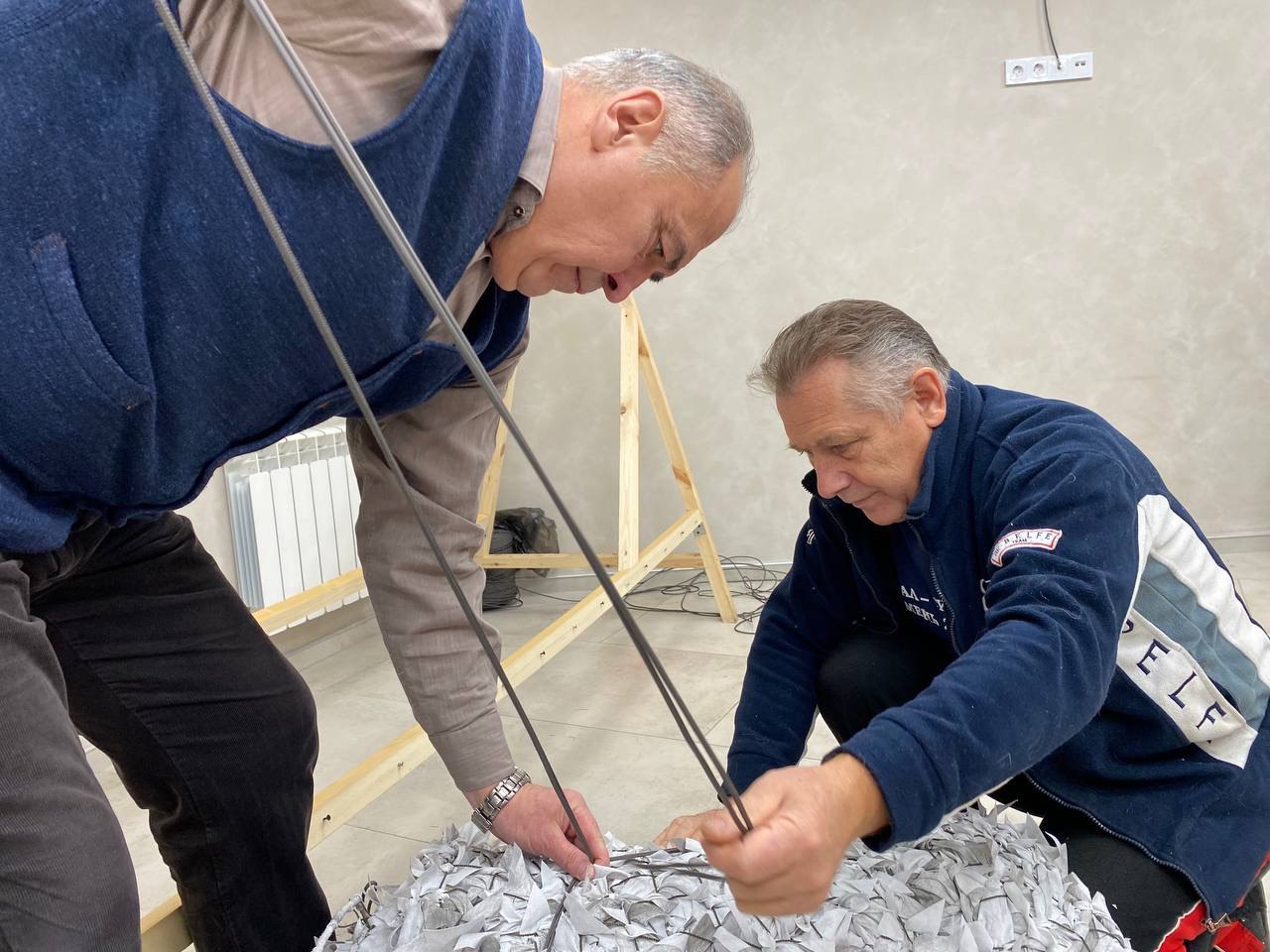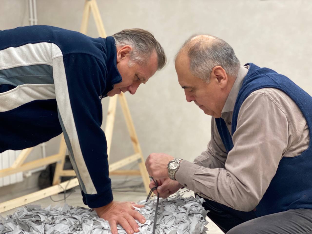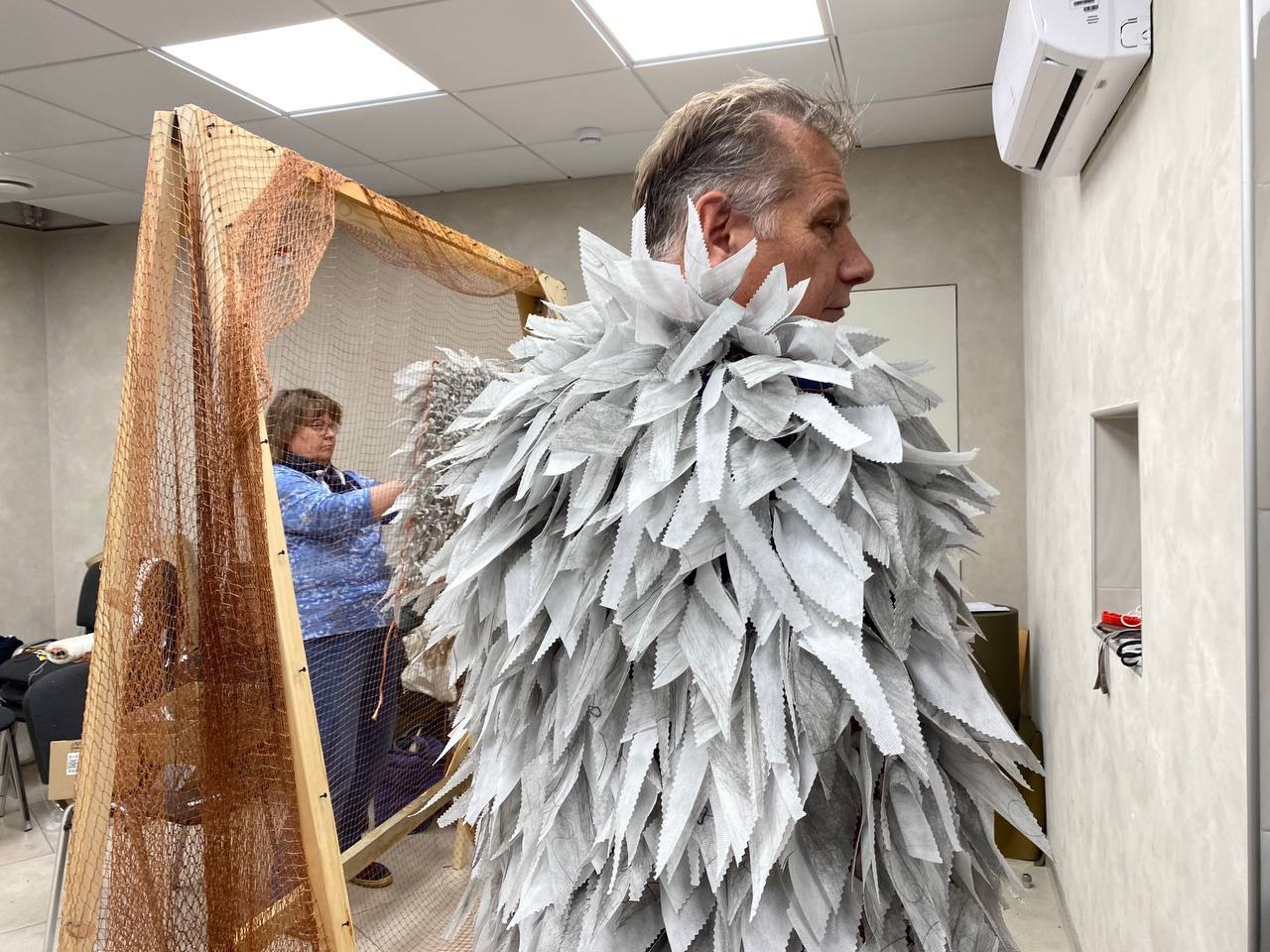 Одновременно с плетением, участники проекта прошли обучение, освоили технологию и в кратчайший срок самостоятельно изготовили свои первые средства индивидуальной маскировки «панцирь» и «нашлемник».
