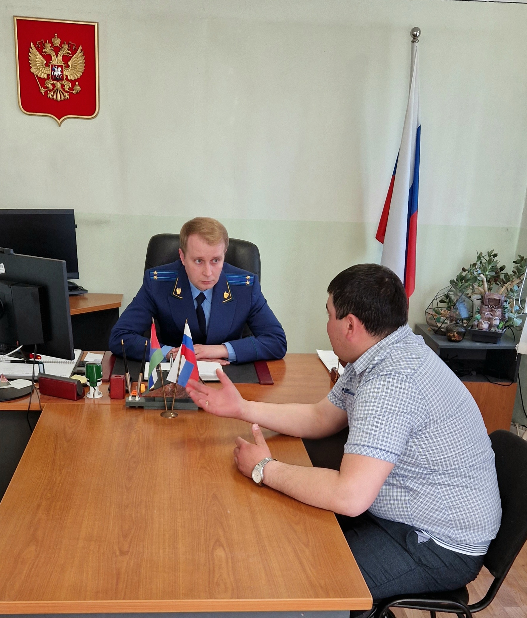 Прокурор Сладковского района Михаил Андриянов провел рабочую встречу с заместителем руководителя сельскохозяйственного производственного кооператива «Таволжан» Нариманом Испердиновым.