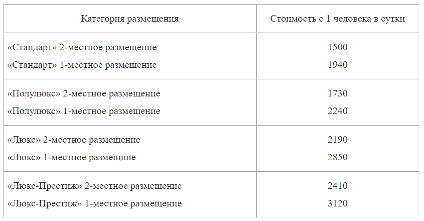 В стоимость входит трехразовое питание, размещение в указанных номерных категориях.
