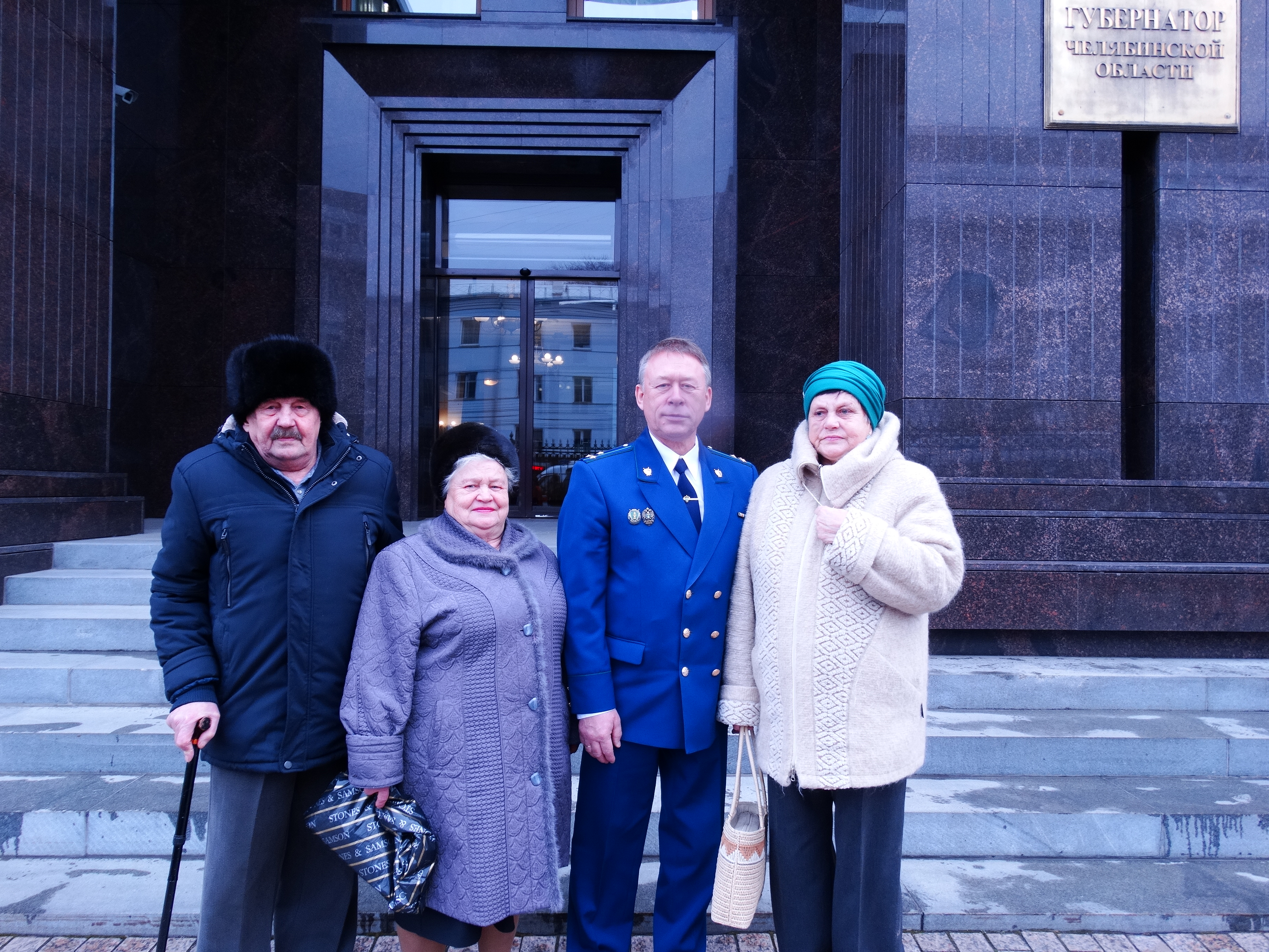 08 ноября 2018 года заместитель прокурора Челябинской области Саломатов Е.Н., старший помощник прокурора области по пенсионному обеспечению Гасс С.В. совместно с родителями работников прокуратуры Николая Симанова и Игоря Анварова, погибших при исполнении служебных обязанностей в Чеченской Республике, приняли участие в губернаторском приеме членов семей сотрудников правоохранительных органов, погибших на службе.