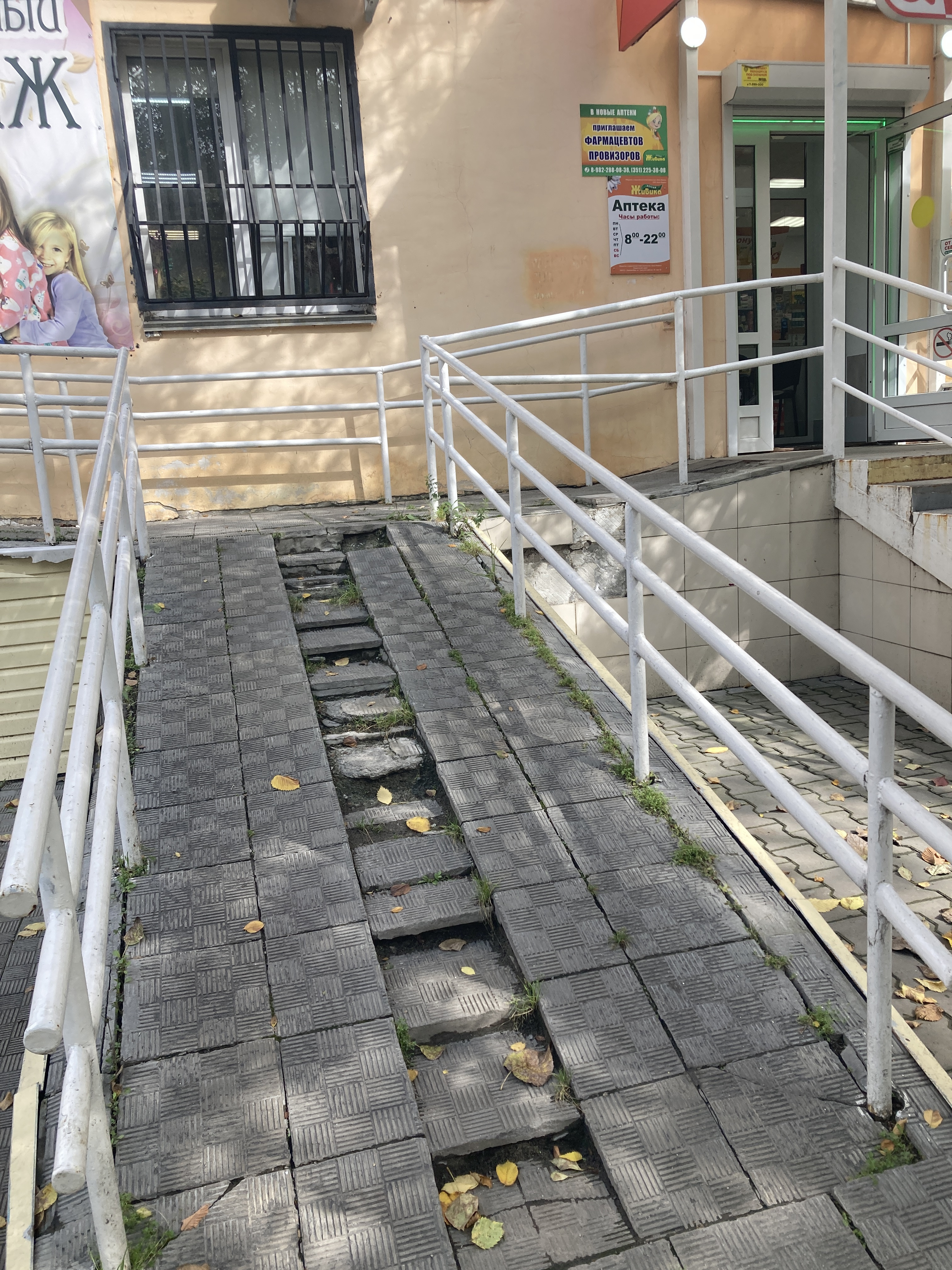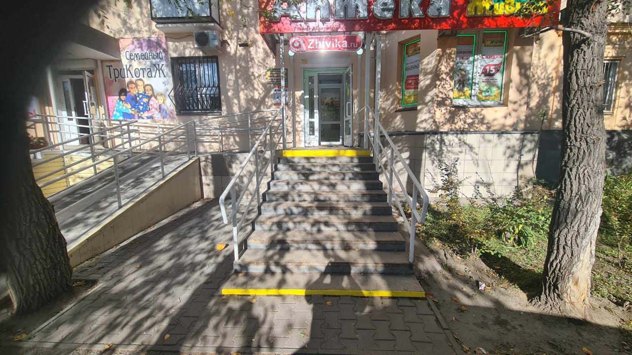 Пандус имеет разрушения, частично отсутствуютперила и плитка, что создает угрозу при использовании.Кроме того, на первых и последних ступенях лестниц, ведущих в аптеку, частично отсутствует контрастное выделение.