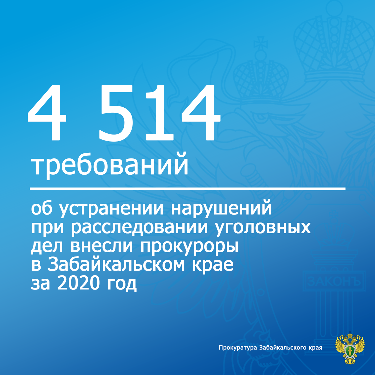 Цифра дня: более 4,5 тыс. требований об устранении нарушений при расследовании уголовных дел внесли прокуроры в Забайкальском крае за 2020 г.
