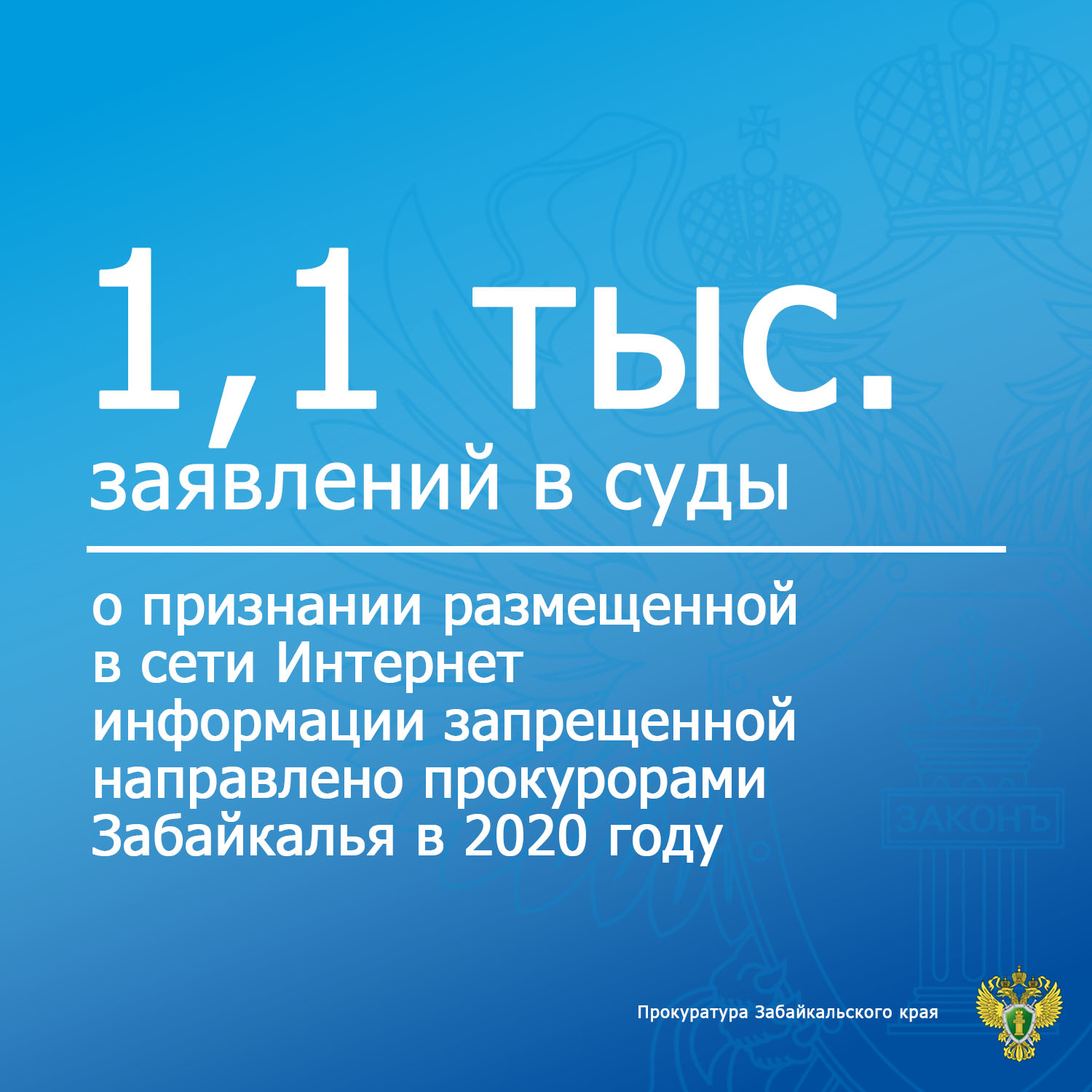 Органы прокуратуры Забайкальского края уделяют особое внимание вопросам укрепления законности, защиты интересов государства и общества, в также прав граждан в интернет-пространстве. В целях ограничения свободного доступа к ресурсам с противозаконным содержанием прокуроры широко используют полномочия по обращению в суд – за истекший период 2020 года направлено более 1,1 тыс. таких заявлений.