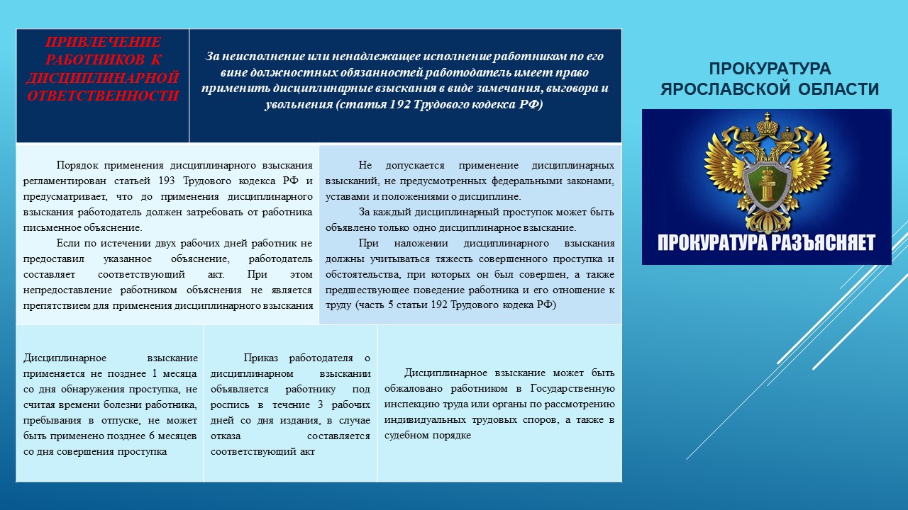 Прокуратура Ярославской области разработала памятку по вопросам привлечения работников к дисциплинарной ответственности.
