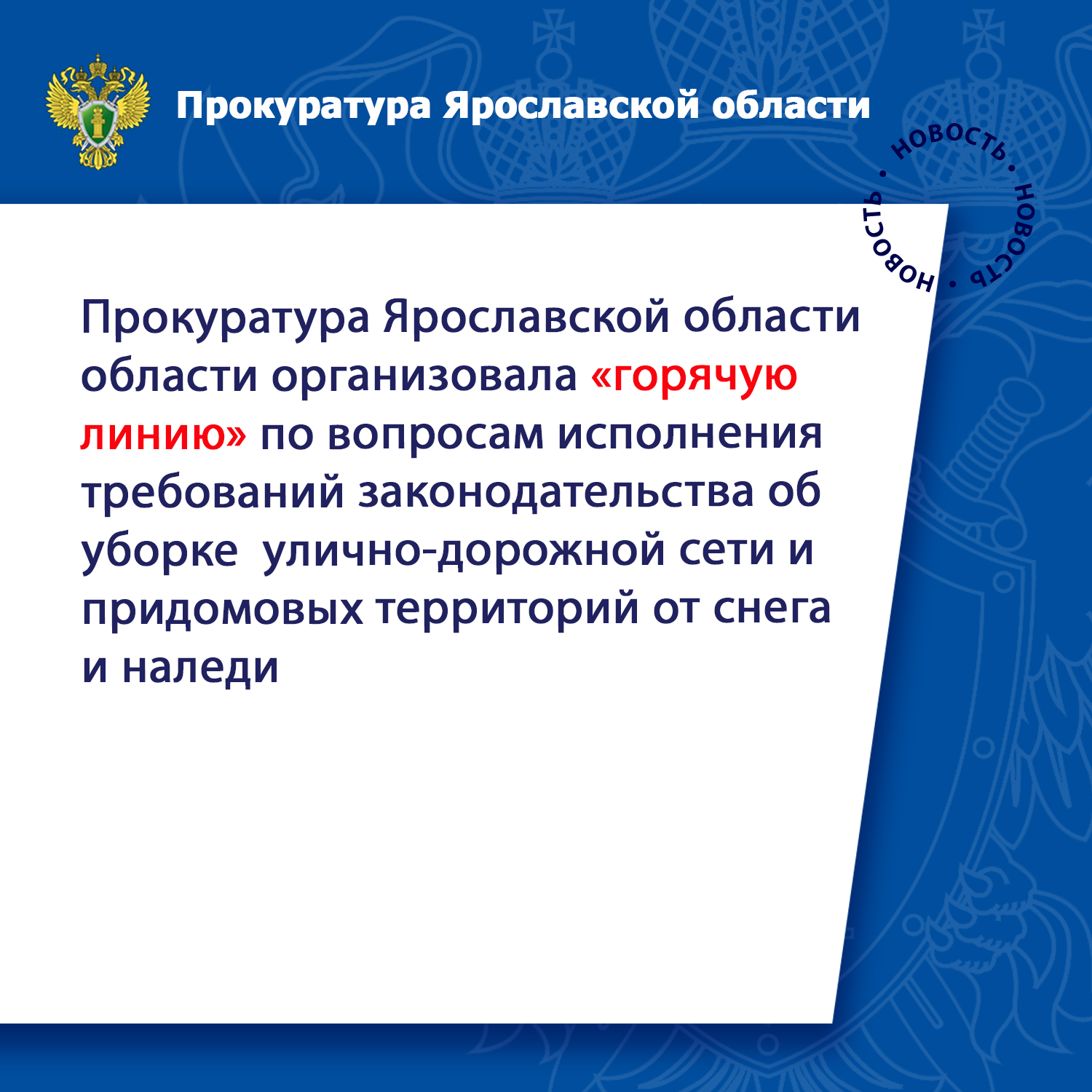 Прокуратура Ярославской области организовала «горячую линию» по вопросам исполнения требований законодательства об уборке улично-дорожной сети и придомовых территорий от снега и наледи.