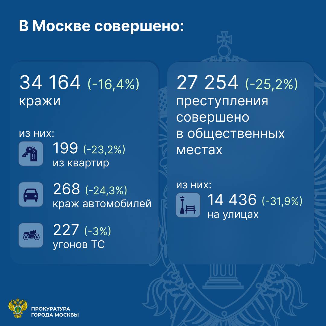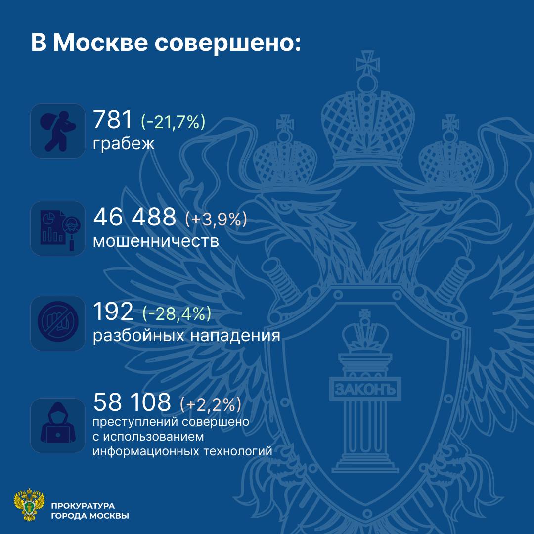 В Москве зарегистрированы: 781 (-21,7%) грабеж, 46 488 (+3,9%) мошенничеств,192 (-28,4%) разбойных нападения,34 164 (-16,4%) кражи, в том числе199 (-23,2%) из квартир, 268 (-24,3%) краж автомобилей, 227(-3%) угонов транспортных средств, 58 108 (+2,2) преступлений совершенос использованием информационных технологий.