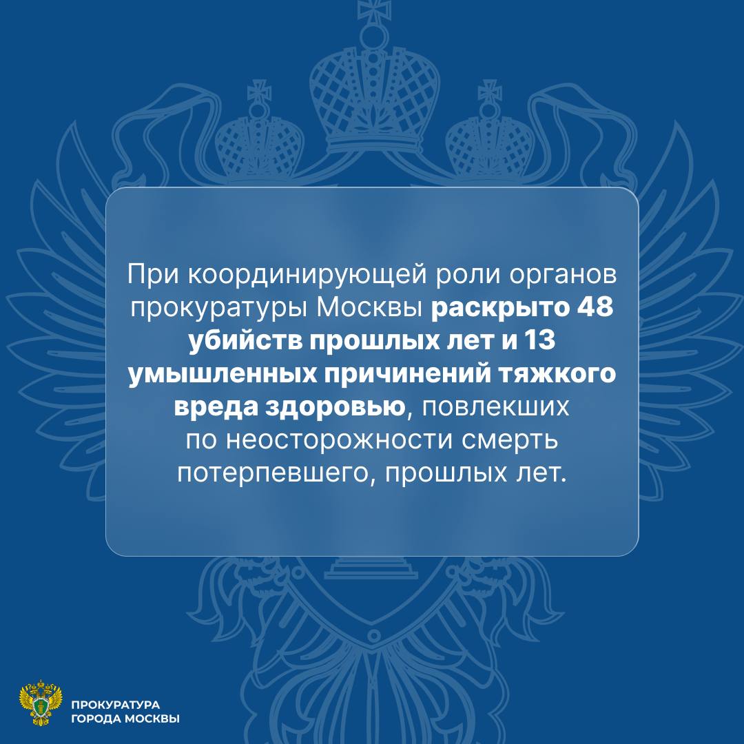 При координирующей роли органов прокуратуры Москвы раскрыто 48 убийств прошлых лет и 13 умышленных причинений тяжкого вреда здоровью, повлекших по неосторожности смерть потерпевшего, прошлых лет.