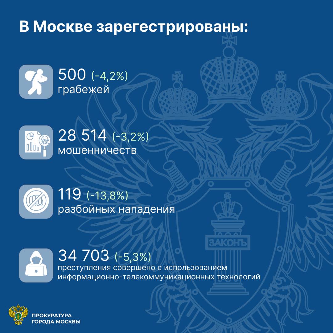 В Москве совершены 500 (-4,2%) грабежей, 28514 (-3,2%) мошенничеств, 119 (-13,8%) разбойных нападений, 17943 (-14,7%) кражи, в том числе 81 (-39,1%) из квартир и 106 (-34,6%) краж автомобилей, а также 150 (+3,4%) угонов транспортных средств.