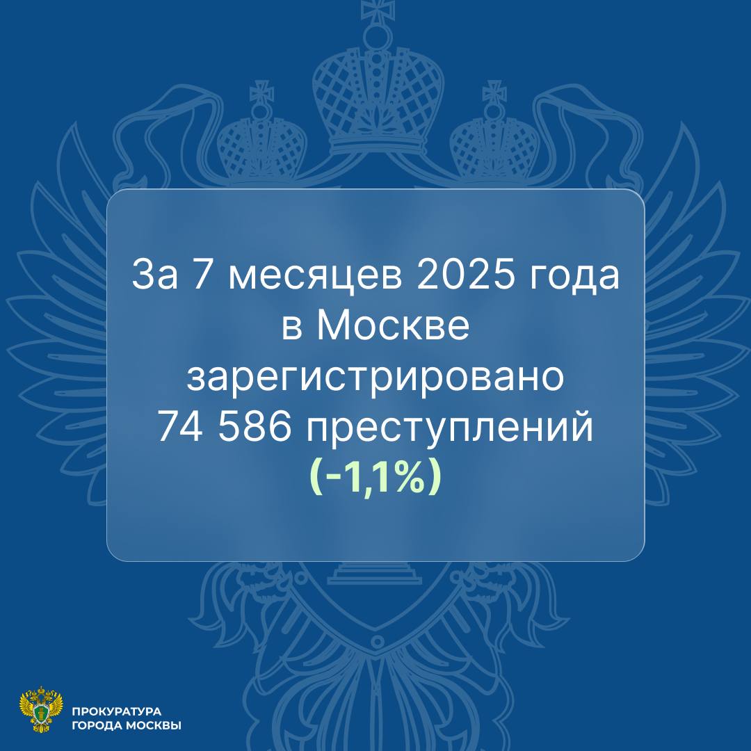 За 7 месяцев 2025 года в Москве зарегистрировано 74586 (-1,1%) преступлений.