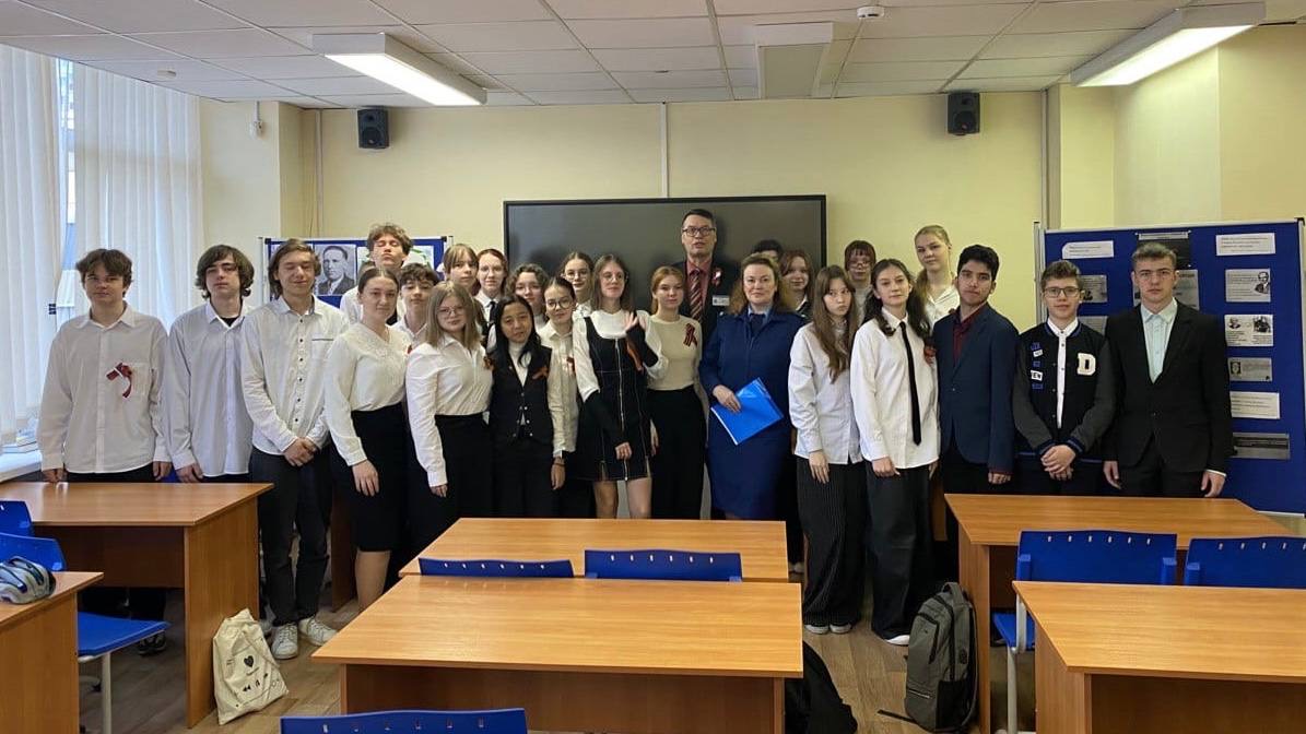 Заместитель прокурора Красносельского района г. Санкт-Петербурга Татьяна Третьяк рассказала школьникам о подвигах советских солдат на полях сражений, в том числе об истории своего дедушки – Федора Семеновича Рыжкова, который был тяжело ранен в самом крупном танковом сражение на Курской дуге.