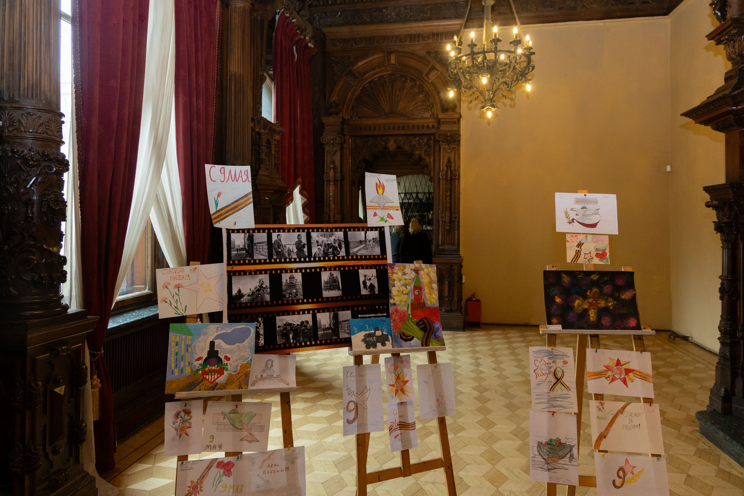 В изысканных интерьерах соседнего зала – орехового кабинета, в целях демонстрации преемственности поколений, связи между прошлым, настоящим и будущим, были выставлены рисунки, фотоработы, поделки детей работников прокуратуры г. Санкт-Петербурга. Участники мероприятия смогли увидеть в представленных детских работах слова благодарности ветеранам за победу, величие и самоотверженность подвига русского народа глазами детей. С использованием различных техник детьми показаны исторические события, связанные с блокадой Ленинграда, а также уважение к истории произошедшего события.