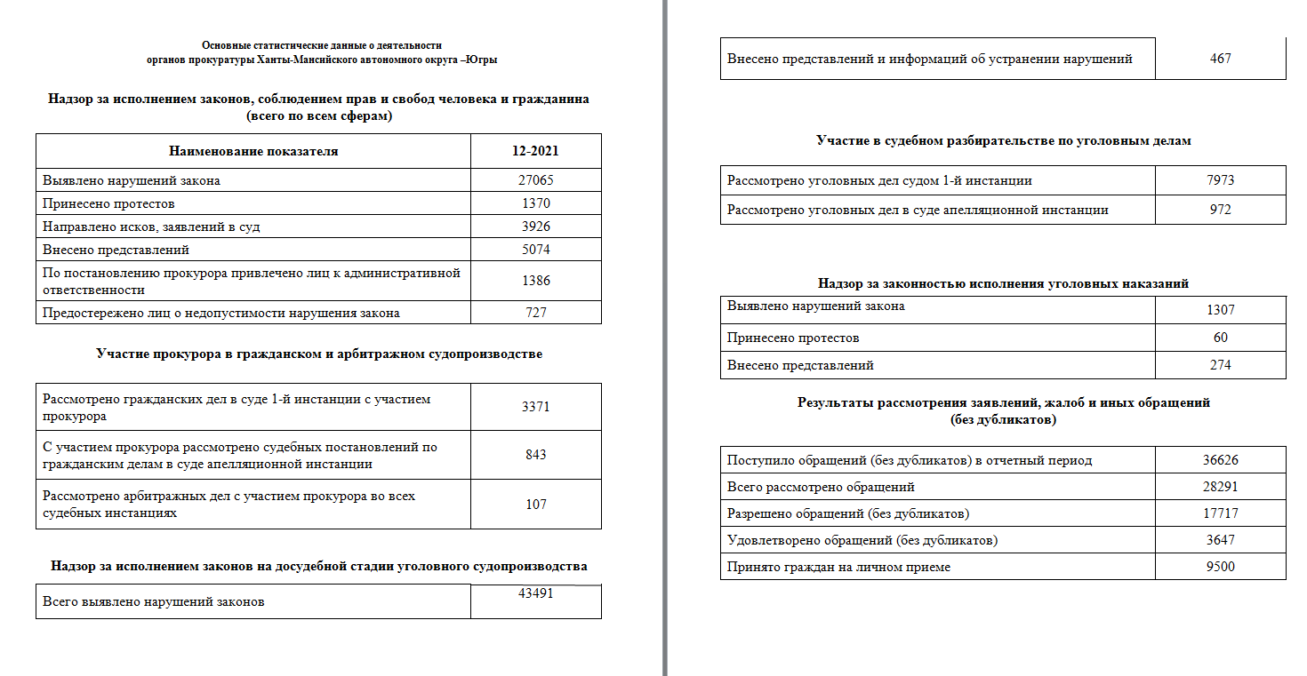 Основные статистические данные о деятельности органов прокуратуры Ханты-Мансийского автономного округа –Югры за 12 месяцев 2021 года