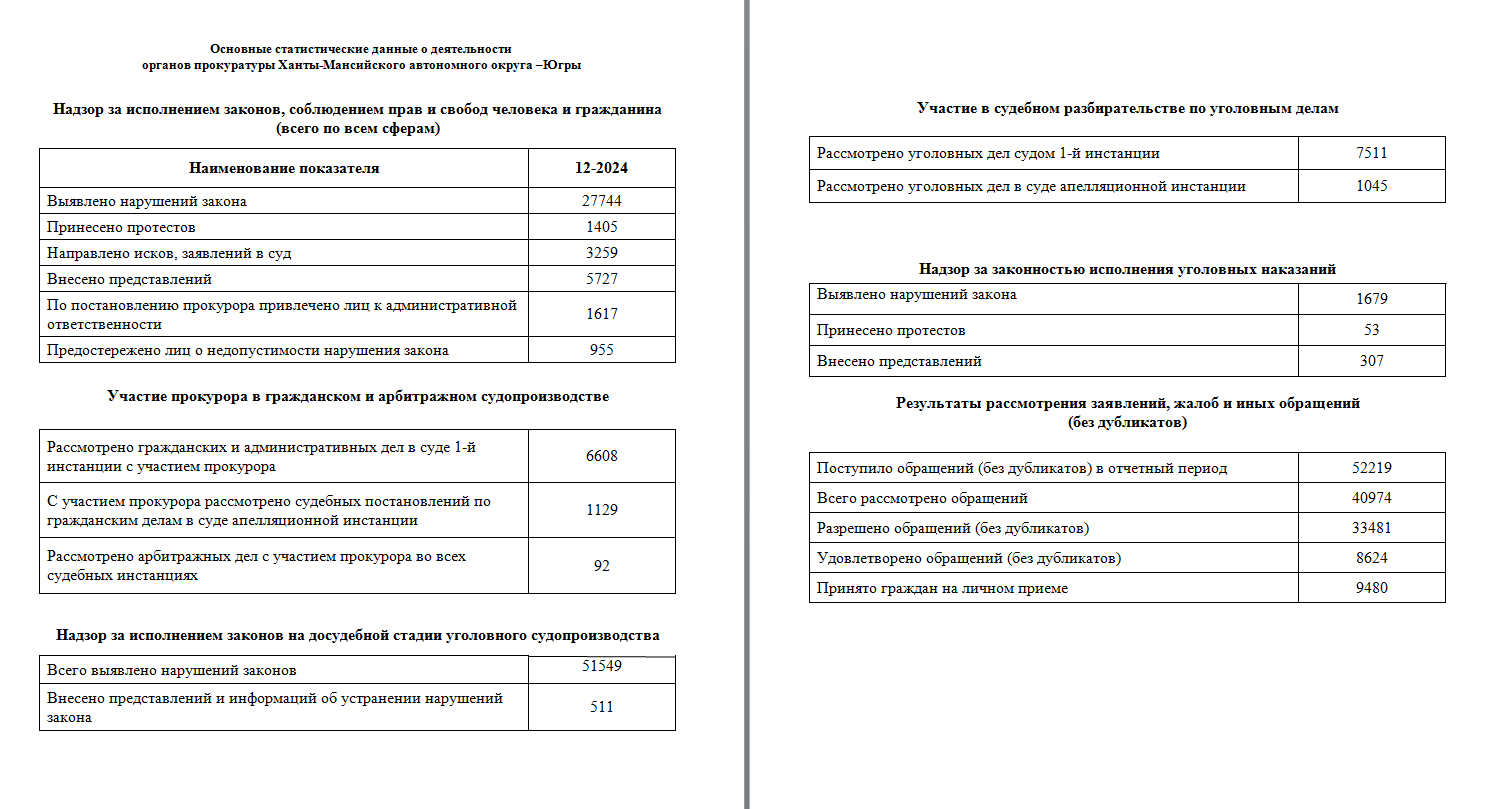 Основные статистические данные о деятельности органов прокуратуры Ханты-Мансийского автономного округа –Югры за 12 месяцев 2024 года