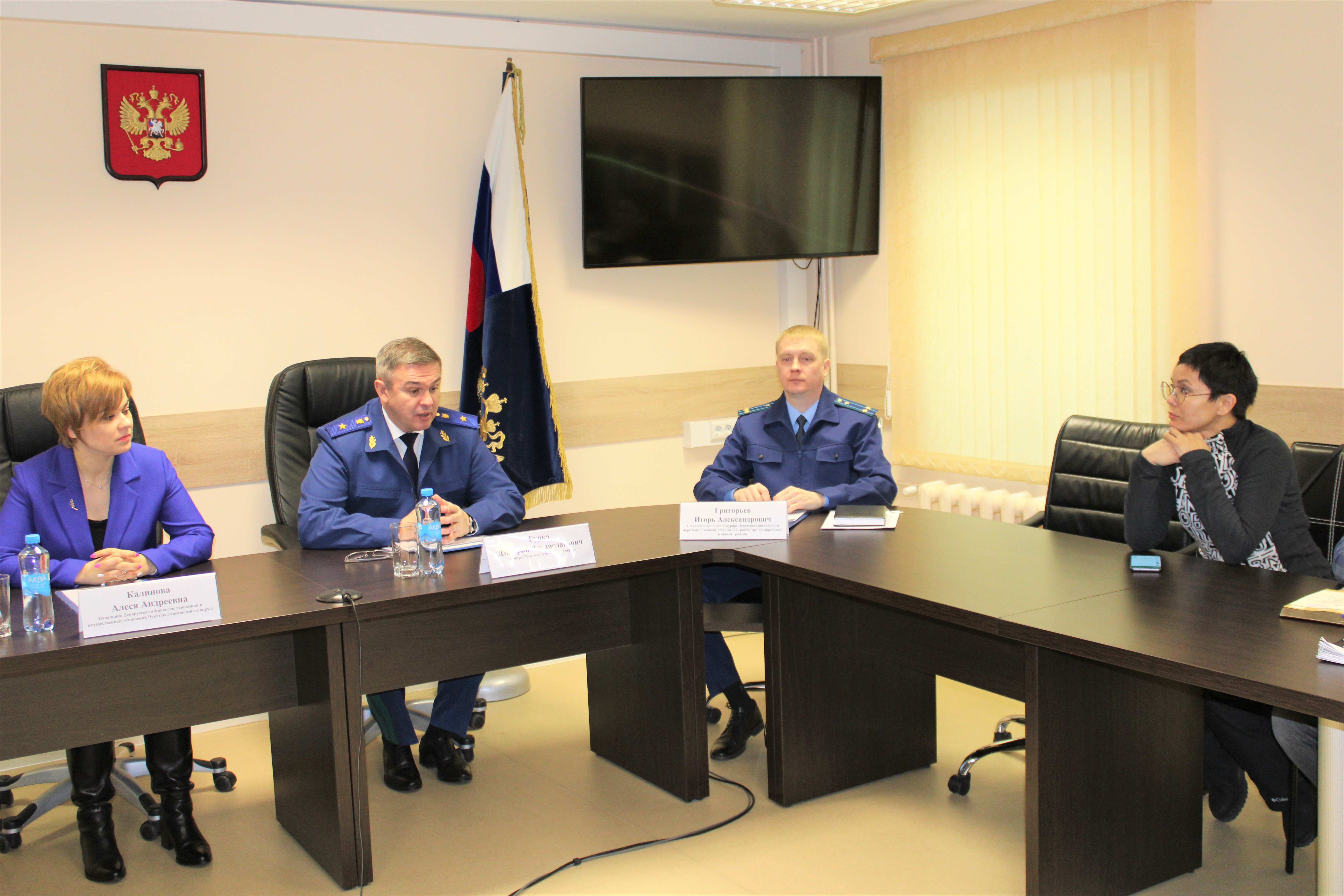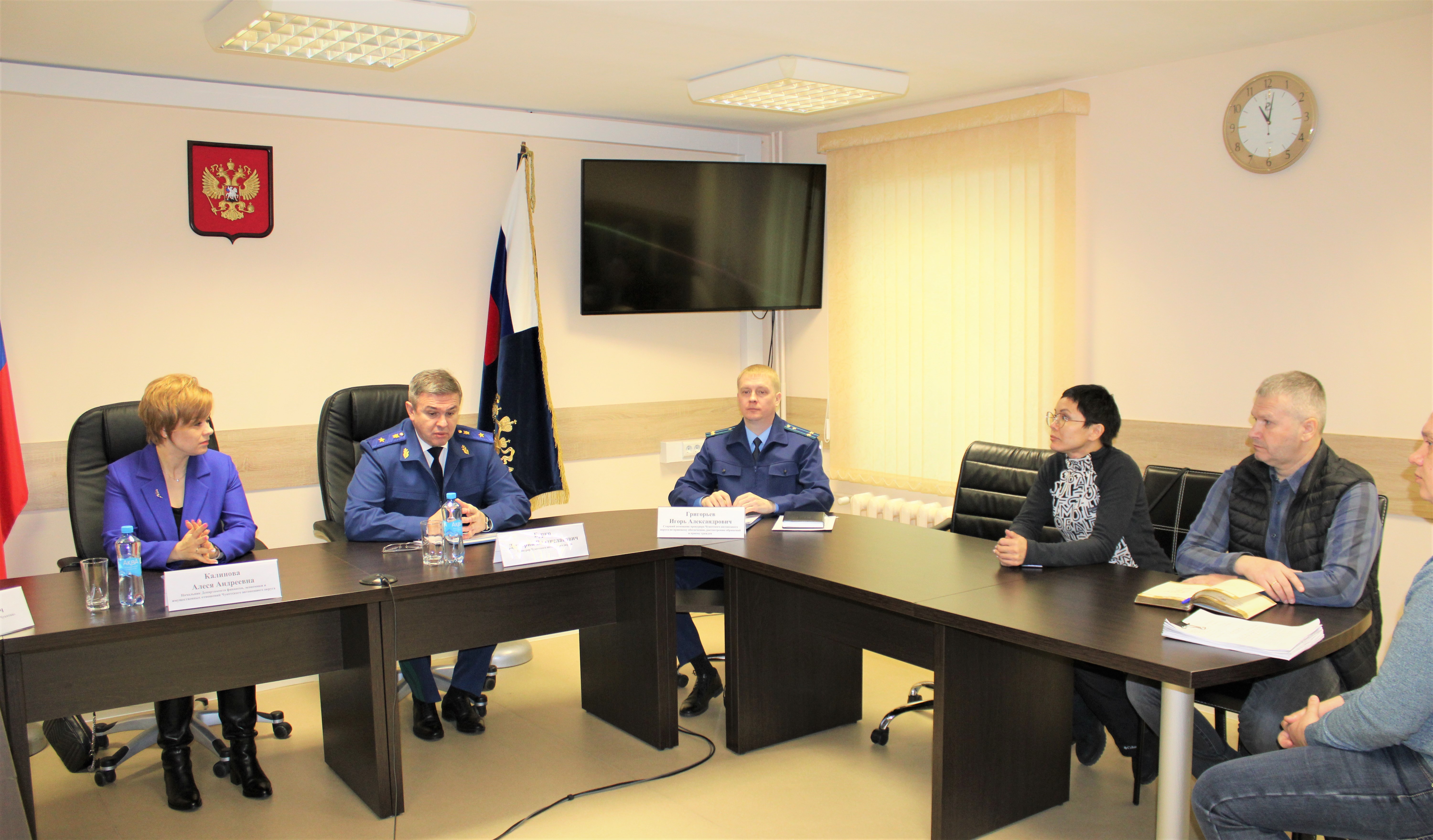 В связи с проведением Всероссийского дня приема предпринимателей 7 февраля 2023 года в прокуратуре Чукотского автономного округа под председательством прокурора округа Дмитрия Бурко состоялась рабочая встреча, в которой приняли участие первый заместитель Губернатора – Председателя Правительства округа Алеся Калинова, заместитель директора ООО «КРДВ «Чукотка» Павел Бакулин, а также резиденты территории опережающего социально-экономического развития региона.