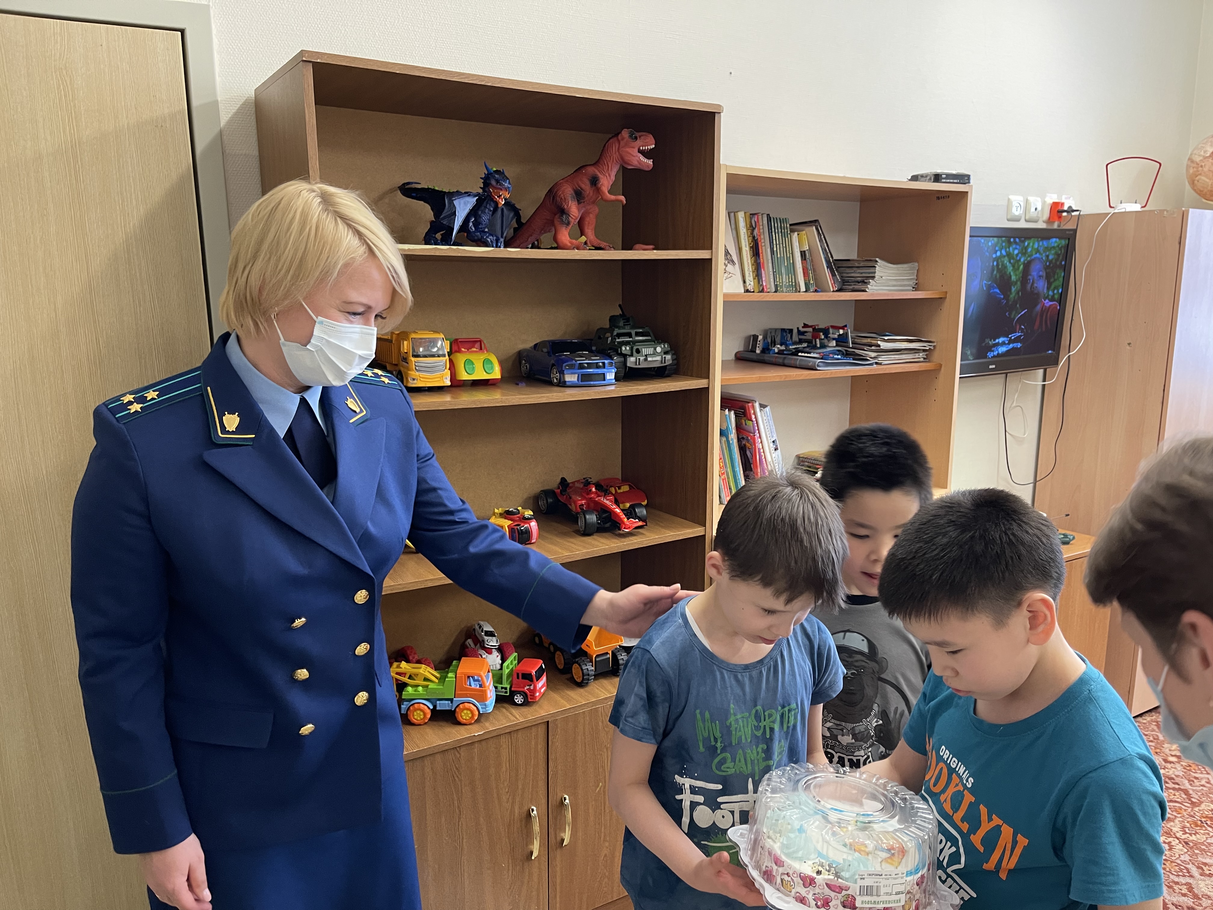 Старший помощник прокурора округа Елена Груздева вручила детям сладкие подарки, пожелала крепкого здоровья и мира.