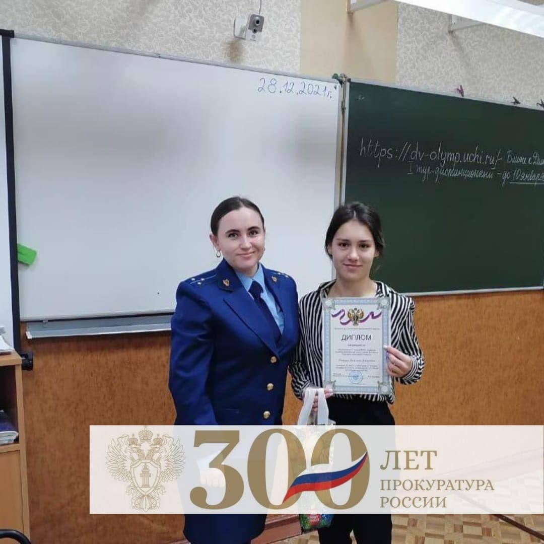 Старший помощник прокурора Билибинского района Анна Калемина от имени и по поручению прокурора округа Константина Прохорова провела награждение победителей олимпиады по истории государства и права, посвящённой юбилейной дате - 300-летию со дня образования российской прокуратуры.
