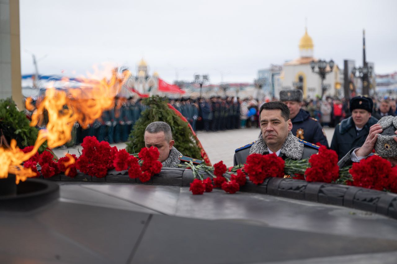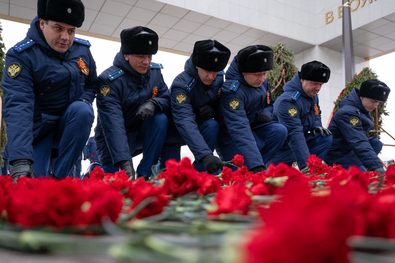 Прокурор автономного округа Дмитрий Конош с сотрудниками ведомства принял участие в параде служащих силовых структур, отдав дань памяти возложением цветов на мемориале и равнением на Знамя Победы.