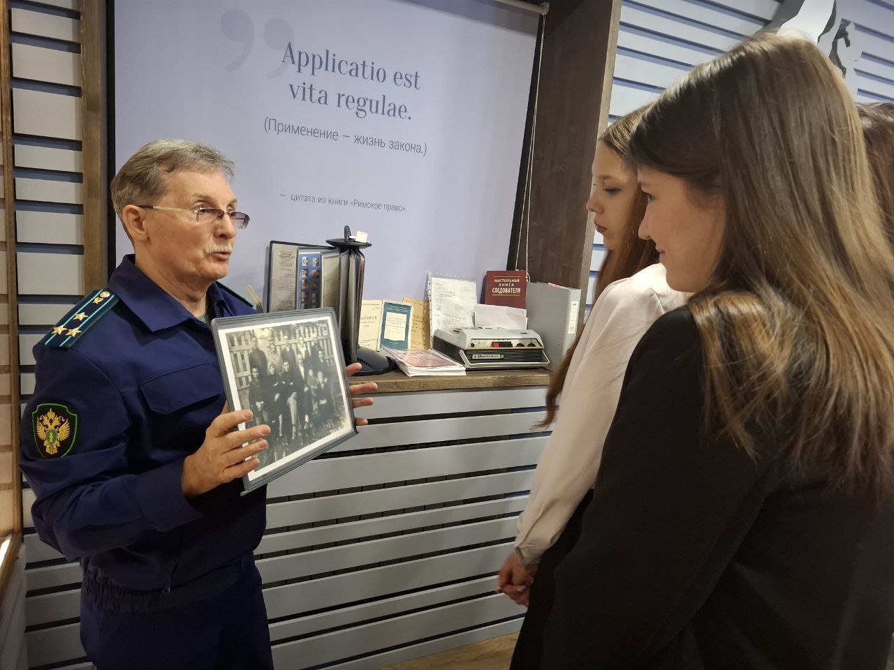 Представитель Ямало-Ненецкого окружного регионального отделения Общероссийской общественной организации ветеранов и пенсионеров прокуратуры Андрей Дробинин рассказал участникам экскурсии об истории органов прокуратуры России, условиях работы с момента создания до настоящих дней, о подвиге советского народа, одержавшего Победу в Великой Отечественной войне.