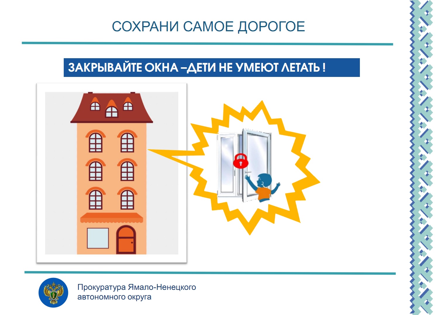 Прокуратура автономного округа призывает законных представителей малолетних детей не оставлять их без присмотра в помещении, окна которого открыты и (или) не оборудованы запорными устройствами.