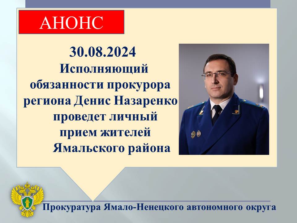 Исполняющий обязанности прокурора Ямало-Ненецкого автономного округа Денис Георгиевич Назаренко 30.08.2024 с 09.00 ч. проведет личный прием жителей Ямальского района.