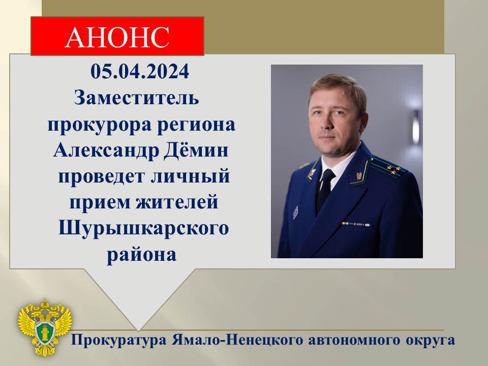 Заместитель прокурора Ямало-Ненецкого автономного округа Александр Викторович Демин 05.04.2024 с 13.00 ч. проведет личный прием жителей Шурышкарского района.