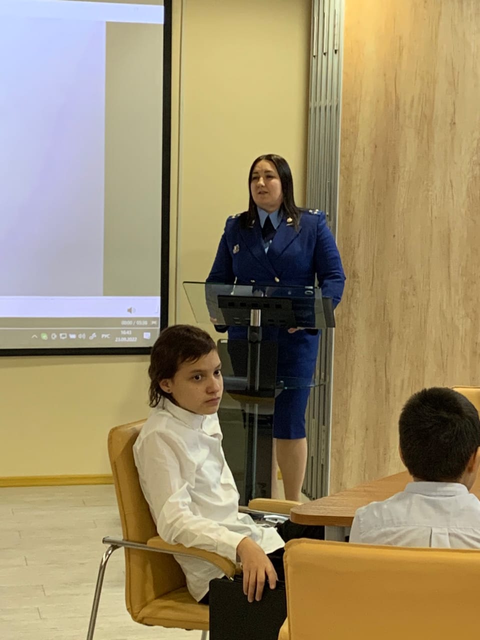 Старшим помощником прокурора округа по надзору за исполнением законов о несовершеннолетних и молодежи Татьяной Трубицыной в рамках мероприятий по правовому просвещению и патриотическому воспитанию на базе Национальной библиотеки ЯНАО проведена встреча с учащимися МАОУ «Лицей» г. Салехарда.
