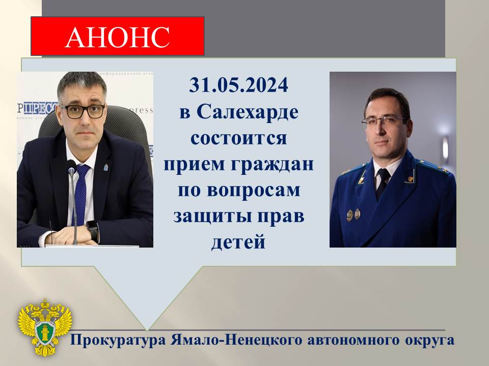 31 мая 2024 г. с 10.00 час. исполняющий обязанности прокурора Ямало-Ненецкого автономного округа Денис Назаренко совместно с Уполномоченным по правам ребенка в регионе Данило Трубицыным проведет прием граждан по вопросам защиты прав несовершеннолетних, в том числе с использованием средств видеоконференцсвязи.