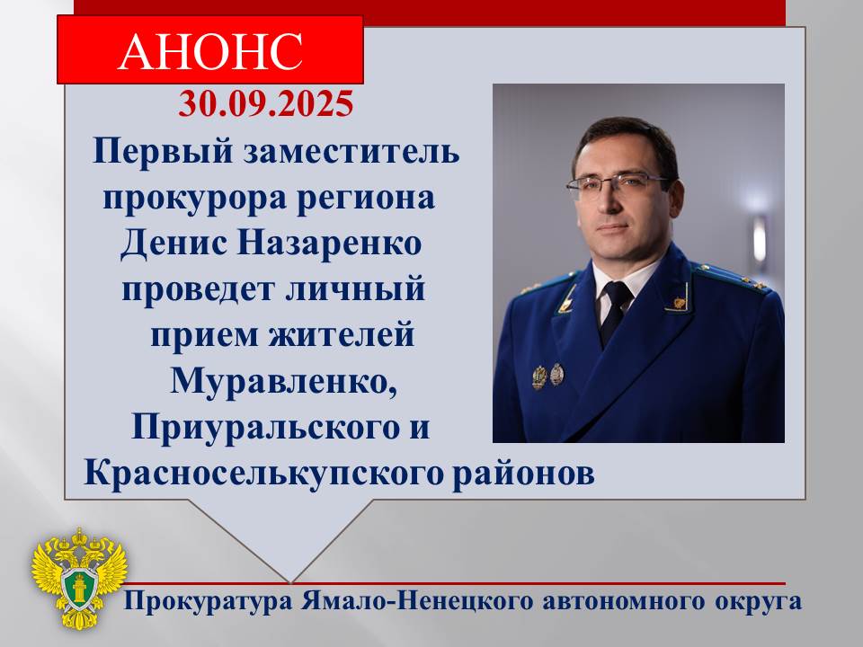 Первый заместитель прокурора автономного округа Денис Назаренко 30.09.2025 в 10.00 час. проведет в режиме видеоконференцсвязи личный прием граждан в прокуратурах Муравленко, Приуральского и Красноселькупского районов.