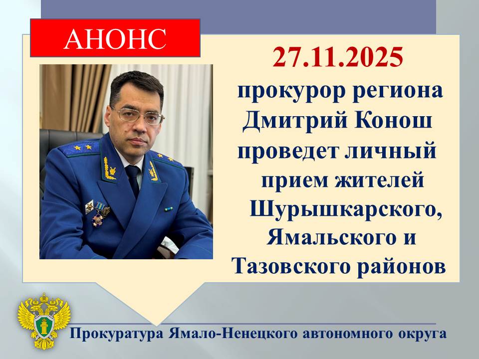 АНОНС. Прокурор автономного округа Дмитрий Конош 27.11.2025 проведет личный прием жителей Шурышкарского, Ямальского, Тазовского районов