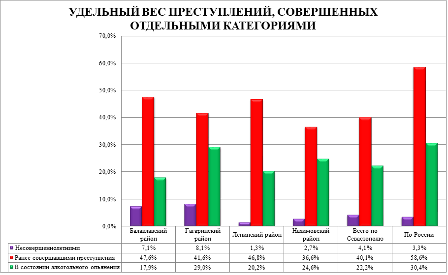 Количество преступлений особо тяжкой и тяжкой категорий возросло на 180 единиц, или 59,4%, в том числе в Ленинском районе на 66 единиц (81,5%), в Балаклавском районе на 26 единиц (65,0%), в Гагаринском районе на 25 единиц (26,6%), в Нахимовском районе на 11 единиц (15,5%).