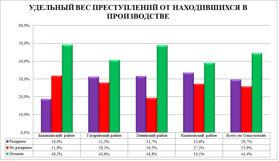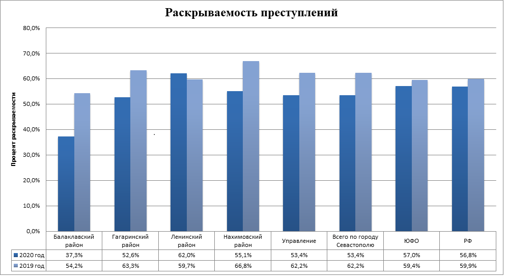 Процент раскрываемости преступлений составил 53,4% (раскрыто 774, не раскрыто 676 преступлений). По итогам работы за 4 месяца 2019 года раскрываемость составляла 62,2% (раскрыто 735, не раскрыто 446 преступлений). В Ленинском районе раскрываемость возросла с 59,7% до 62,0%. Снизилась раскрываемость преступлений в Балаклавском районе с 54,2% до 37,3%, в Нахимовском районе с 66,8% до 55,1%, в Гагаринском районе с 63,3% до 52,6%. (Приложение 4).