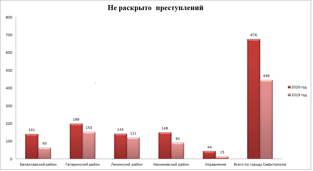 За аналогичный период 2019 года было не раскрыто 446 преступлений (рост на 230 единиц, или 51,6%). Количество нераскрытых преступлений возросло в Балаклавском районе на 76 единиц (116,9%), в Нахимовском районе на 57 единиц (62,0%), в Гагаринском районе на 46 единиц (30,1%), в Ленинском районе на 22 единицы (18,2%). (Приложение 3)